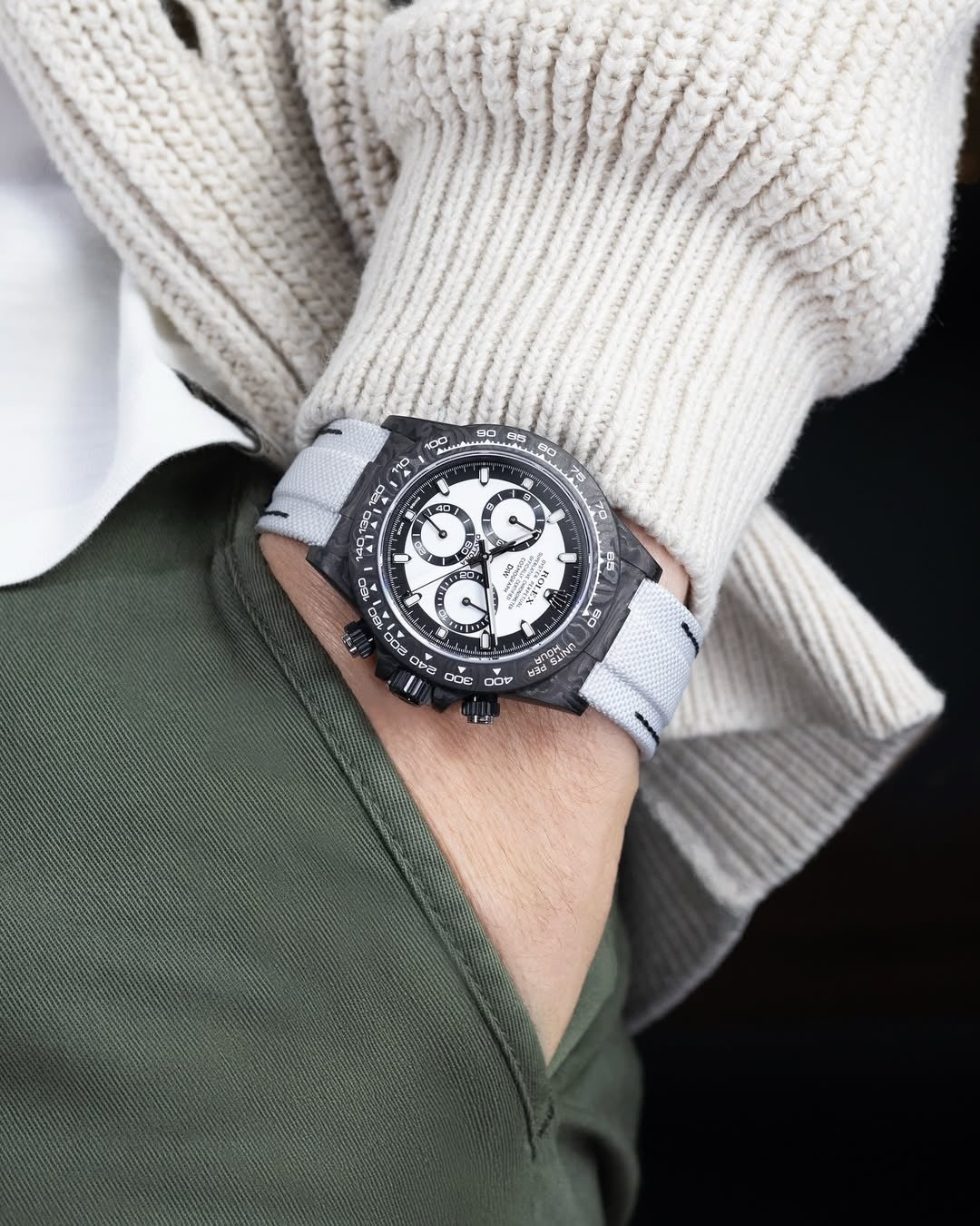 本モデルは、伝統的なツートーンのロレックス デイトナをモチーフに、ホワイトダイヤルとブラックカーボンベゼル、白のインデックスが織りなす洗練されたデザインが特徴。ストラップには文字盤と調和するスモーキーホワイトを採用し、細部までこだわり抜かれた特別なモデルに仕上がっています。