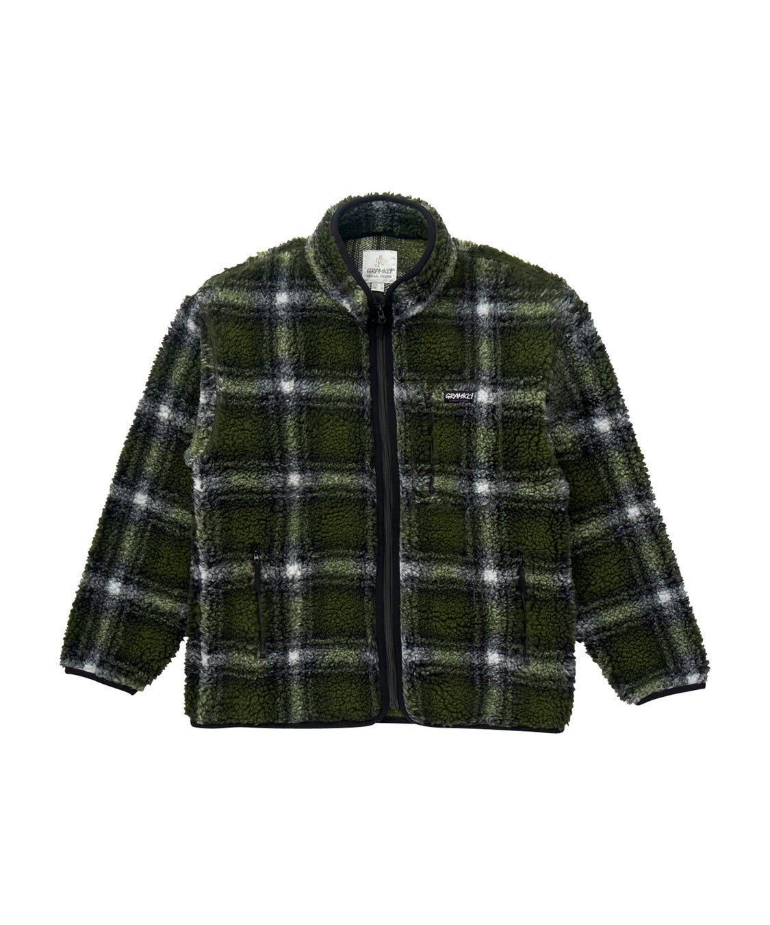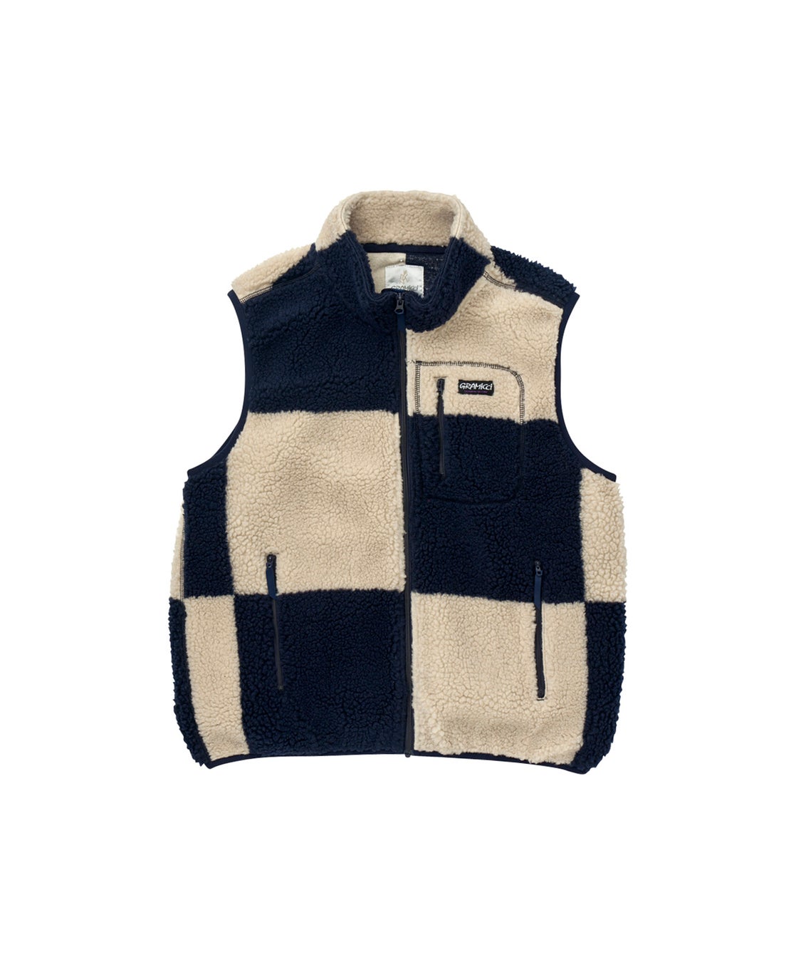 羊のようにモコモコした、暖かくボリューム感のある、オリジナルチェッカージャガードのボアベストです。衿端・アームホール・裾廻りにはテープを使用し、風の侵入を軽減します。両脇と左胸にジップ付きポケットを備えています。