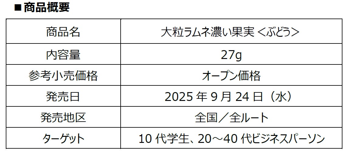「森永ラムネ」は、おやつだけでなく仕事や勉強で集中したい時・リフレッシュしたい時など、幅広いシーンでお楽しみいただいており、「集中したい時」が多い受験生やビジネスパーソンにご愛用いただいています。この度発売する「大粒ラムネ濃い果実<ぶどう>」は、ぶどう果汁30%(生果汁換算率)※配合し、みずみずしいぶどうの果実感あふれる味わいが特長で、リラックスして気持ちを切り替えたい時や、次の頑張りに向かいたい時に、お役立ていただきたいという想いから発売いたします。