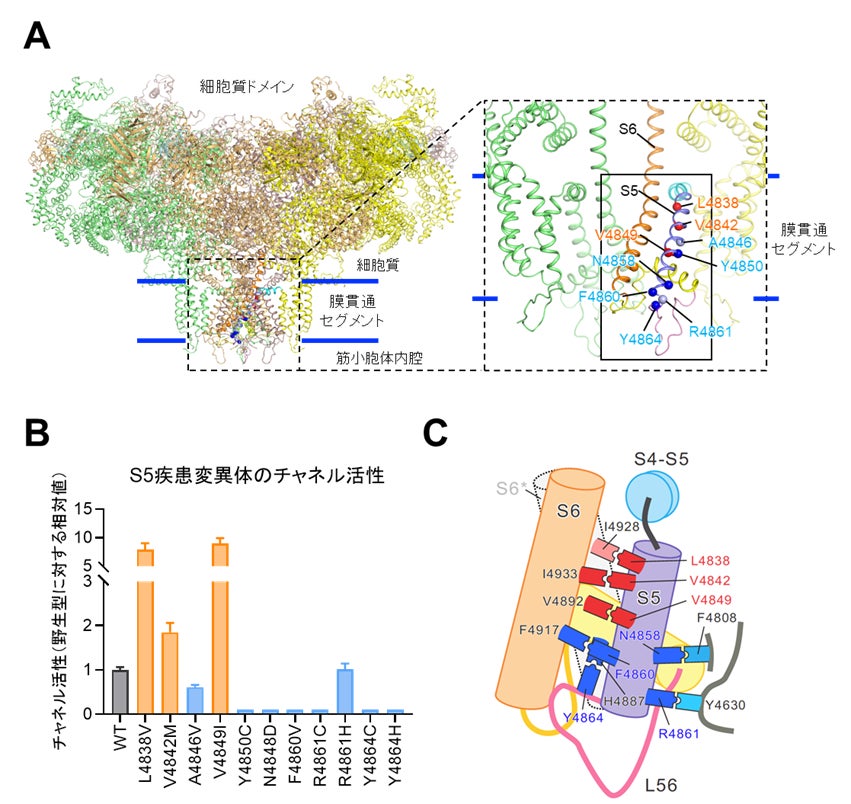 1型リアノジン受容体(RyR1)は骨格筋筋小胞体のカルシウム(Ca2+)遊離チャネルで筋収縮に重要な役割を果たしています。RyR1の遺伝子突然変異は悪性高熱症(MH)およびセントラルコア病(CCD)の原因となります。MHは外科手術時の吸入麻酔薬により高熱を発する疾患で、RyR1の機能亢進により起こります。一方、CCDは筋力低下を主な症状とする難病で、RyR1の機能低下が原因です。RyR1の膜貫通セグメントは6本から構成され、S5は約30アミノ酸からなる5番目のセグメントです。チャネルポアの形成に関与すると考えられていますが、チャネル活性制御に対する役割は不明でした。研究グループが疾患データベースを調べたところ、S5には10以上の疾患変異が存在し、MHとCCDの両方の変異が報告されていました。本研究ではS5によるRyR1チャネル制御機構を明らかにするため、S5に存在する疾患変異の網羅的な機能解析を行いました。