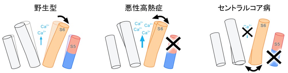以上の結果から、S5は細胞質側でS6の動きを抑制的に制御していること、小胞体内腔側でチャネルの開閉に必要な構造基盤の維持に寄与していることが明らかとなりました(図2)。MH変異はS5による抑制を解除することで機能亢進が起こり(図2中央)、CCD変異は構造基盤の破壊により機能欠失を起こすことが示唆されました(図2右)。