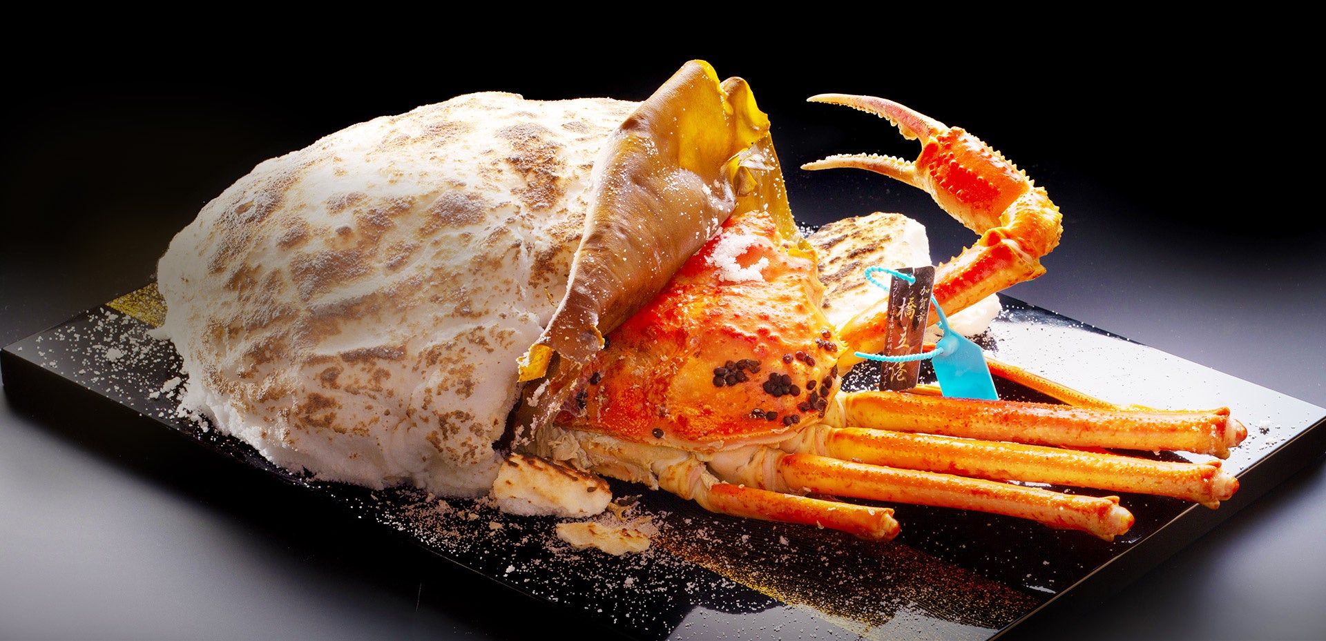 吉祥名物「塩釜昆布焼き」は木槌で塩釜を割る楽しさも !! 目にも美味しい姿 “加能ガニ(かのうがに)” を、塩釜焼・造り・蒸し・天婦羅でご堪能ください。
