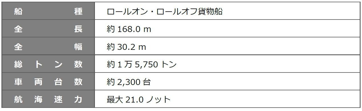 長さ約168.0m、幅約30.2m、総トン数約1万5,750トンの本船は、乗用車約2,300台の積載能力を有しています。