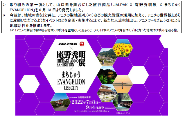 地方自治体と連携したアニメツーリズム商品の第一弾となる当ツアーは、山口県央連携都市圏域(山口市、宇部市、萩市、防府市、美祢市、山陽小野田市、島根県津和野町)の協力のもと、大ヒット映画『シン・エヴァンゲリオン劇場版』のモデル地の一つとなった宇部市を中心に山口県内を巡ることができ、また、ツアー限定のオリジナルグッズや、宇部市で開催される「まちじゅうEVANGELION第2弾」企画(*4)、そして庵野秀明展(*5)を楽しめるなど、アニメファン垂涎の旅行商品となっています。