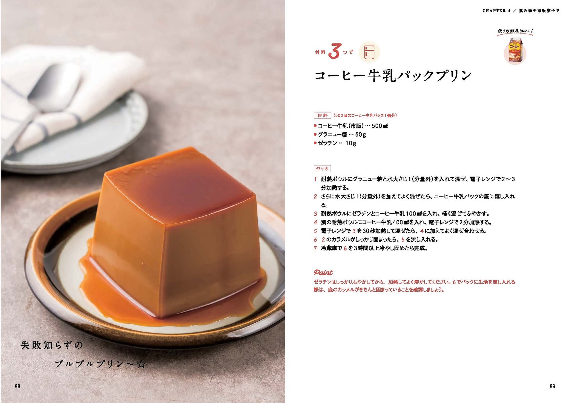 型を使わず牛乳パックやヨーグルトカップをそのまま使うレシピもあり、特別な道具や材料を用意しなくても作れるレシピが満載。「今食べたい!」を叶えるレシピです。なんと材料は4つまで!