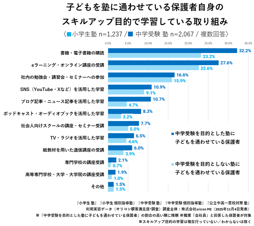 また、小学生の子どもを塾に通わせている(いた)保護者に「保護者自身がスキルアップ目的で行っている取り組みの内容(複数回答)」について聴取したところ、スキルアップ目的の取り組みを行っている保護者(“会社員”が職業の回答者)のなかでは、「書籍・電子書籍の購読」が「中学受験を目的としない塾」に子どもを通わせている保護者では23.2%、「中学受験を目的とした塾」に子どもを通わせている保護者では32.2%で最多となりました。次いで「eラーニング・オンライン講座の受講(22.6%/27.6%)」「社内の勉強会・講習会・セミナーへの参加(15.9%/16.6%)」が続きました。