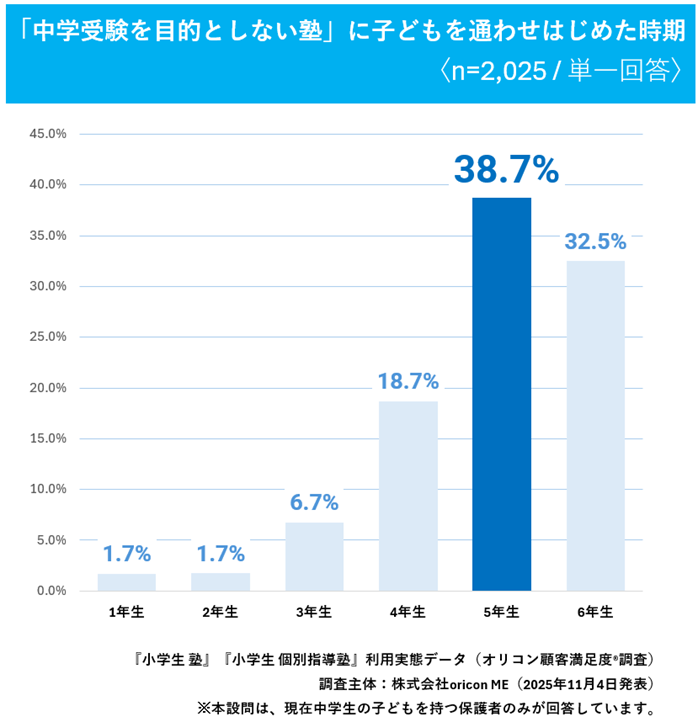 現在中学生の子どもを中学受験を目的としない塾に通わせていた保護者2,025人に「塾に通わせはじめた時期(単一回答)」について聴取したところ、「5年生」が38.7%で最多となりました。次いで、「6年生(32.5%)」、「4年生(18.7%)」と続きました。