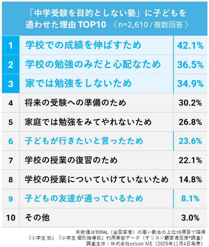 本レポートは、オリコン顧客満足度®調査 11月発表『小学生 塾/個別指導塾』 『中学受験 塾/個別指導塾/公立中高一貫校対策 塾』の2025年調査対象者に別途聴取したデータをまとめたものです。