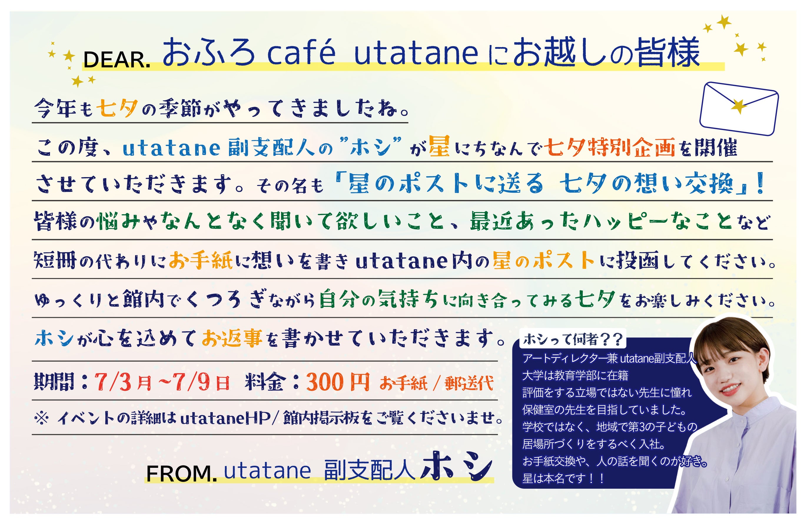 utatane副支配人ホシの念願の企画。デジタル化が進み、なんとも便利なこの時代。今やスマホ/PCが常に側にあり言葉を記すことが少なくなったからこそ、七夕を機にお手紙を書いてみませんか? なんとなく誰かに伝えてみたいこと、自分の中で少し重荷になっていること、最近自分をハッピーにさせたことなど...内容は問いません。星のポストに投函ください。