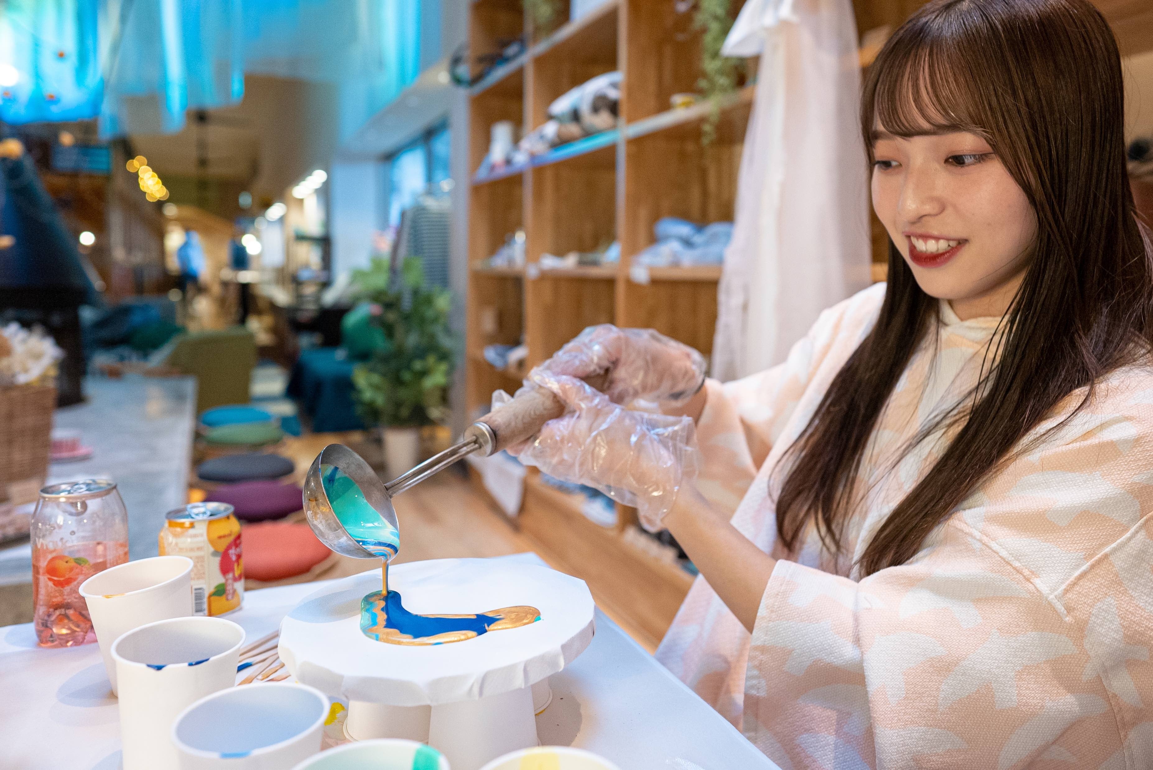 春に大人気だったロウリュアートが、七夕バージョンにパワーアップ。好きな色を選び、柄杓を使ってキャンバスに流し込みます。好きな空を描いたら、最後にスパッタリングという手法で星を描きます。自分好みの星空を描きいてください。