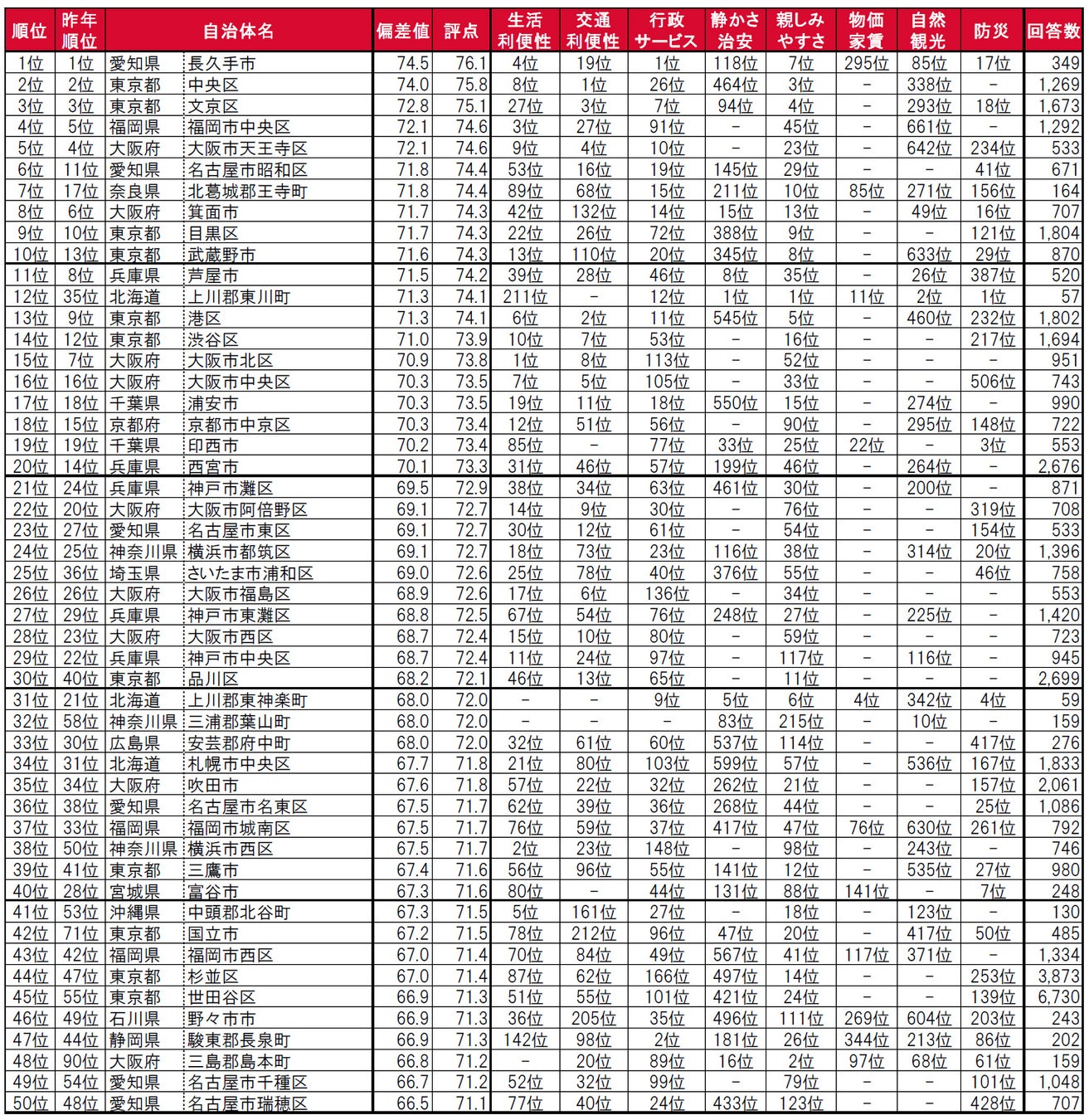 住宅地や商業施設が多く立ち並び、自然も多いベッドタウンの愛知県長久手市が、2年連続で1位です。2位は、4年連続で東京都中央区、3位は、2年連続で東京都文京区という結果になっています。その他、トップ10内では、6位の愛知県名古屋市昭和区(昨年11位)、7位の奈良県北葛城郡王寺町(昨年17位)、10位の東京都武蔵野市(昨年13位)が、それぞれ順位を上げてトップ10入りしています。