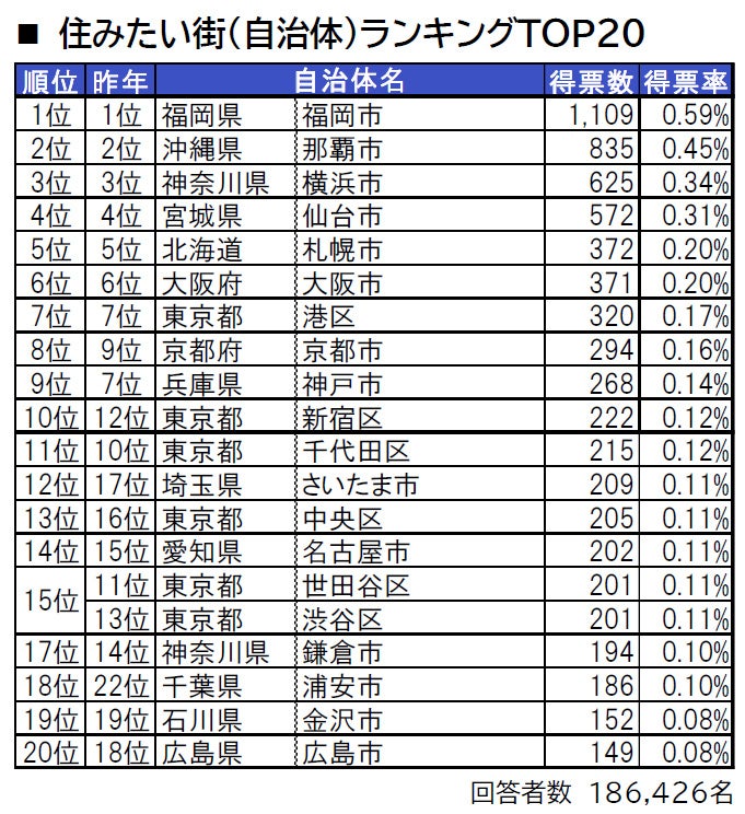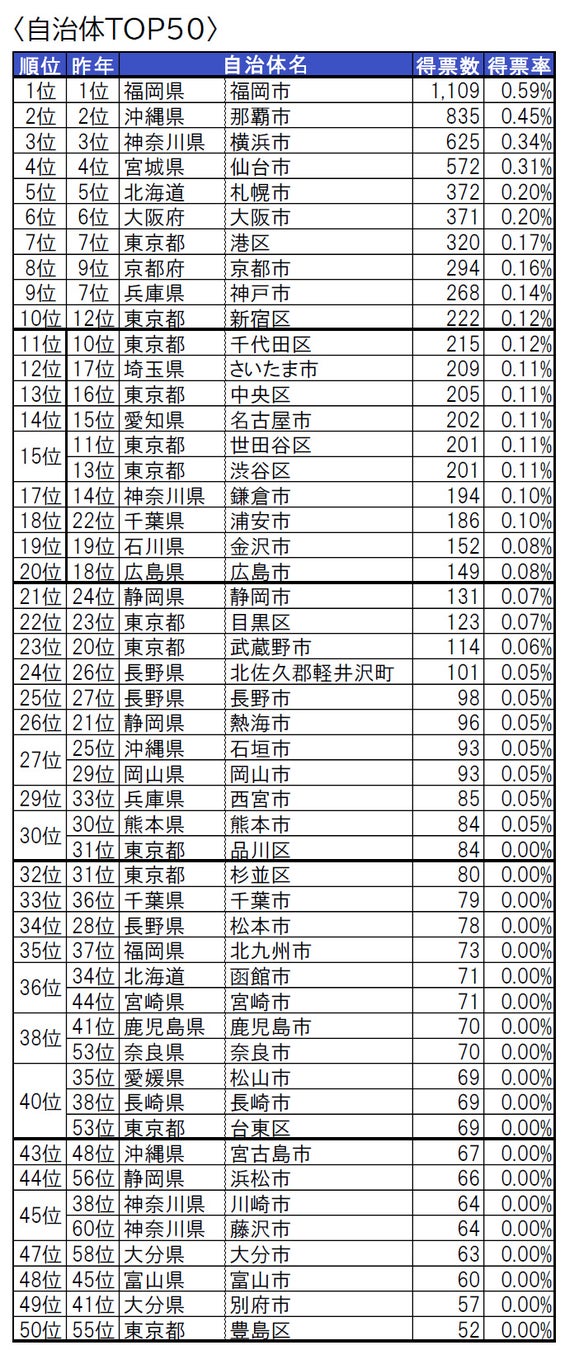 1位は、3年連続で福岡県福岡市です。2位と3位は2年連続で、沖縄県那覇市と神奈川県横浜市です。10位には、東京都新宿区が昨年12位から順位を上げてランクインしています。トップ10内のその他の自治体は、順位変動はあるものの、顔ぶれに変動はありません。