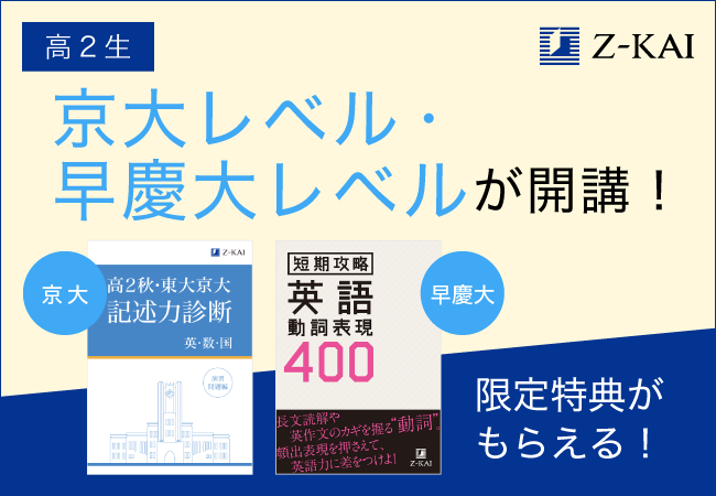 【Z会の通信教育】高2生向け京大レベル/早慶大レベル新規開講!9/14(水)までにお申し込みの高2生の方に、志望大に応じた特典問題集をプレゼント