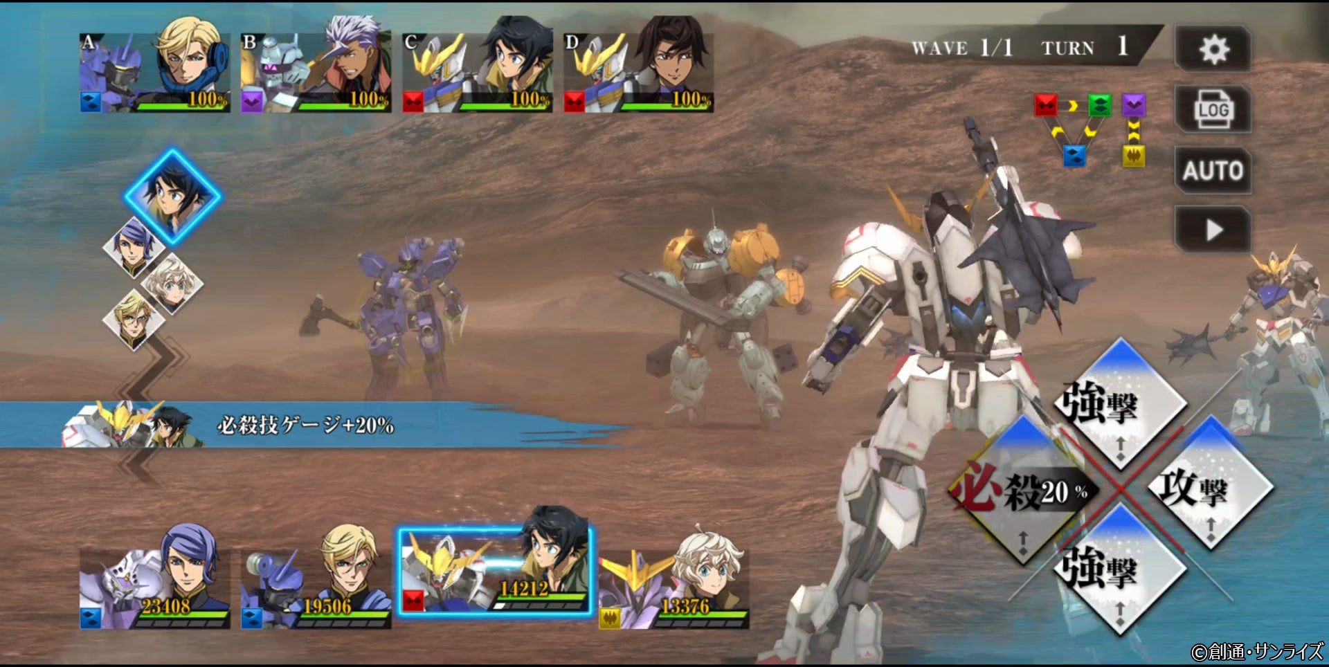 ゲーム内のMS戦は、ターン制のコマンドバトルとなっており、画面に表示されたコマンドを選択することで、ゲームが苦手な方も簡単に『鉄血のオルフェンズ』らしいMS同士の戦いを体験することができます。