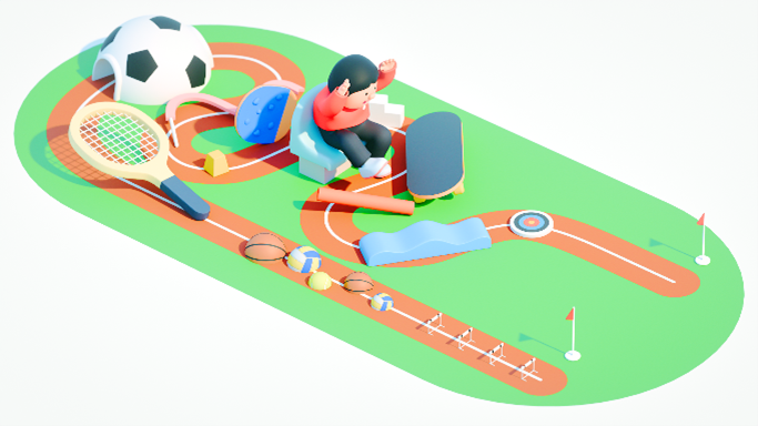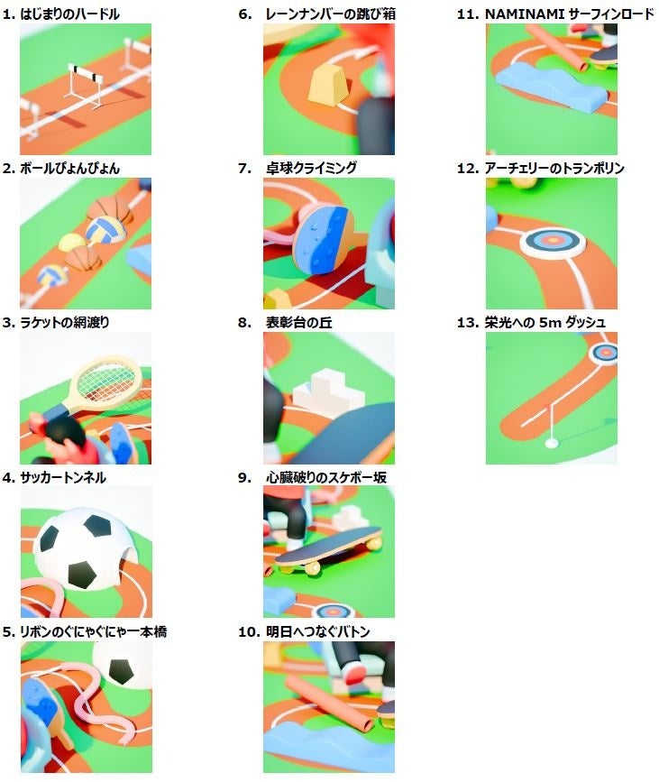 陸上競技のハードルやテニスのラケット、サッカーボールなど、オリンピック競技に用いられる器具をモチーフにした全十三種目の巨大なアスレチック施設です。アスレチックならではの多様な動きを通して、幼児期からの運動習慣形成・健康増進に貢献するとともに、遊びを通して、オリンピックについて興味を持ちTEAM JAPANを応援するきっかけを提供します。