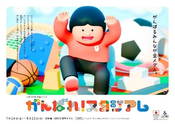 アスレチック施設の真ん中には、『がんばれ!スタジアム presented by 三井不動産』のシンボルキャラクターである巨大な「がんばれちゃん」が登場します。胸にTEAM JAPANのエンブレムをつけた「がんばれちゃん」は、このアスレチックに挑戦する無限の可能性を秘めた子供たちのシンボルです。