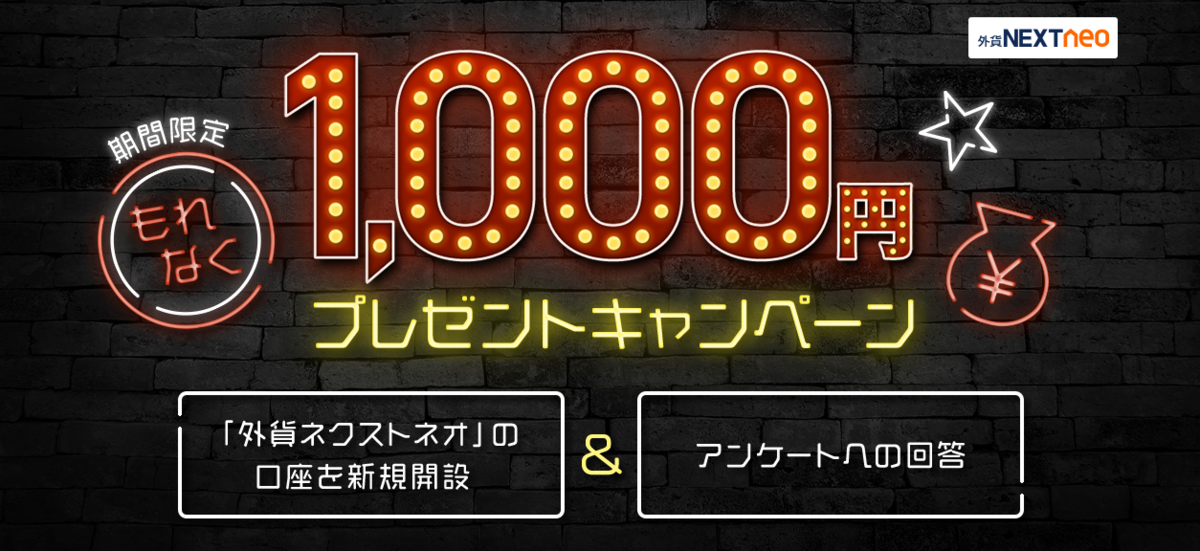 対象期間中に『外貨ネクストネオ』口座を新規開設され、かつ同期間中に所定のアンケートにご回答いただくだけで、もれなく現金1,000円をプレゼントいたします。