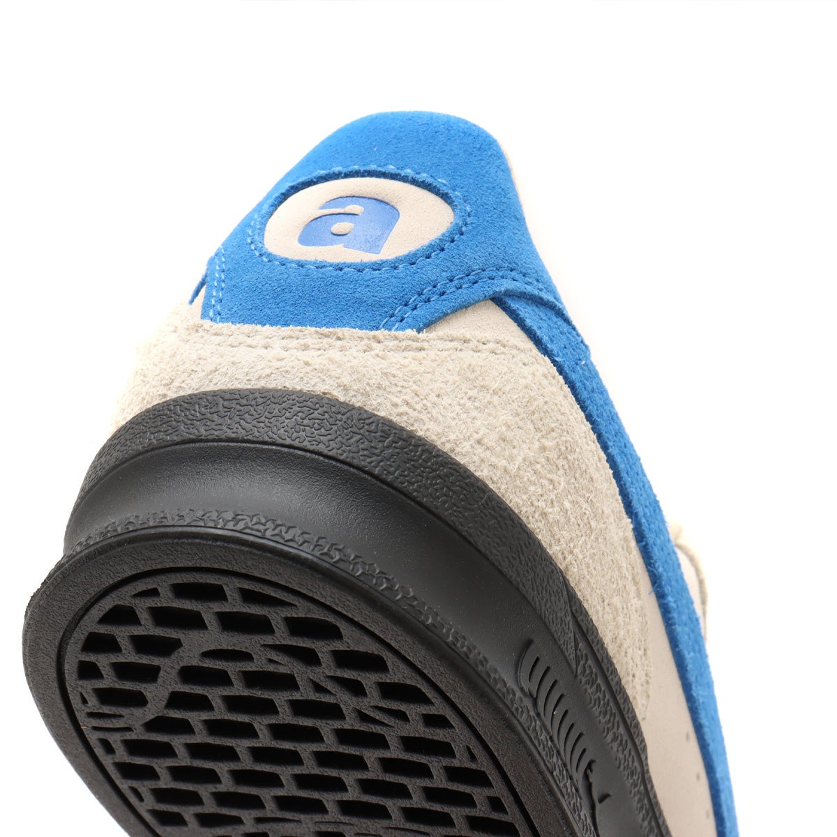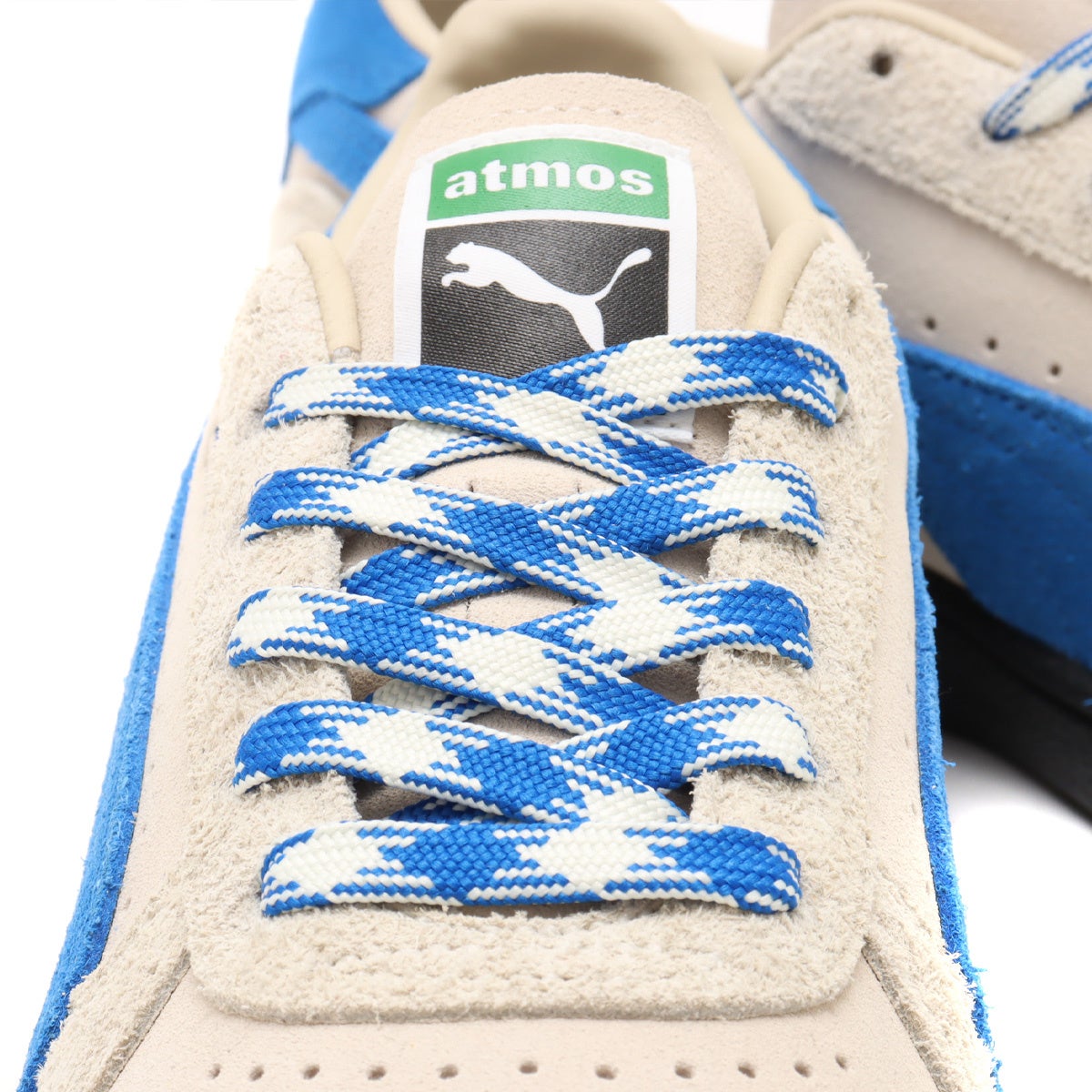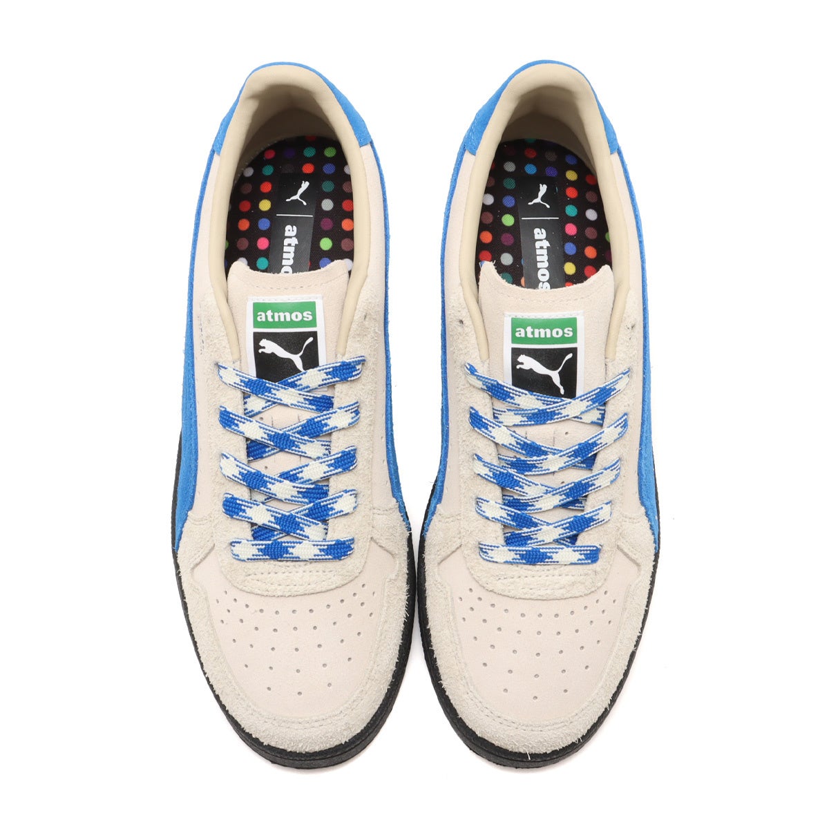 特長的なインソールのドットは、ボトルキャップのカラーチップをモチーフにデザイン。さらに、サイドのフォームストリップやシューレースのブルーは別注を証左する「atmos」のアイコニックなカラーを採用。付属のシューレースは、フィギュアの仕上げとなるコーティングを表現するためコーティングシューレースを備え付けています。
