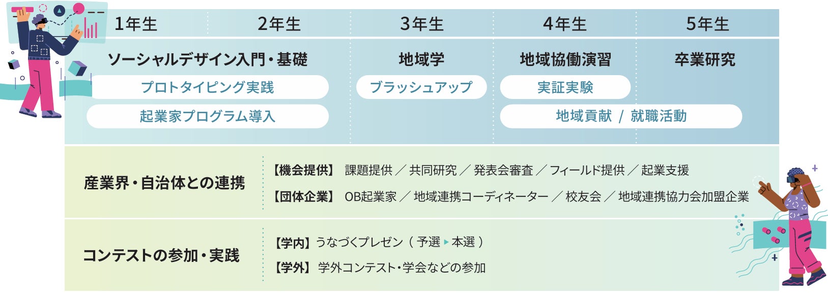 アントレプレナーシップ教育を基盤として、1年次から5年次まで段階的に学ぶ社会実装教育を構築しており、特に4年次の「地域協働演習」を必修科目とし、全学生が地域企業や自治体と協働しながら実社会の課題に取り組む体制を整備しています。こうした中、教育課程全体を通じて社会実装を経験させる体系を正規科目として制度化し、全学生必修で展開している点などが評価され、今回の受賞に至りました。