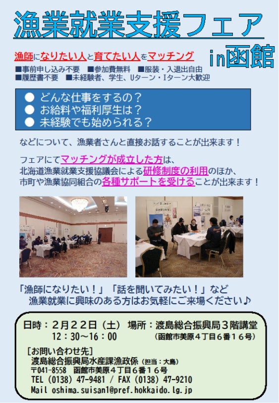 渡島総合振興局では、漁業の担い手不足の回復を目的に「漁業就業支援フェアin函館」を開催します!