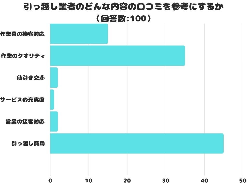 引っ越し業者のどんな内容の口コミを参考にするかをアンケートにて調査したところ、1位は「引っ越し費用」でした。