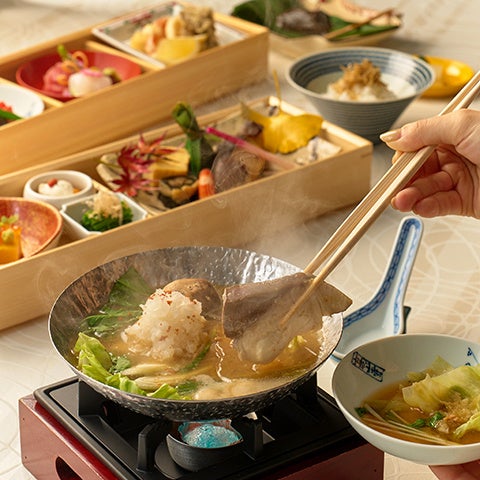 北陸三県で水揚げされた鰤と、相性抜群の大根を心も体もほっこり温まる味噌鍋にしてご用意します。今回は加賀野菜「源助だいこん」の甘味が味わえるように、鬼おろしにして食感をお楽しみいただきます。和食の基本、五味五法を盛り付けた二段重と、冬の季節にぴったりなお鍋が味わえる贅沢な内容です。