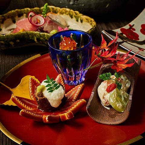 日本料理「大阪 浮橋」では、~北陸の恵み~をテーマに会席料理をご用意しました。旬を迎える「若狭ぐじ」をウロコを落とさずパリッと焼き上げ、野菜と魚介で取った出汁と一緒にお吸い物としてご提供します。淡白ながらも味わい深い若狭ぐじを、出汁の旨味がさらに引き立たせます。是非、北陸の日本酒と共にお楽しみください。