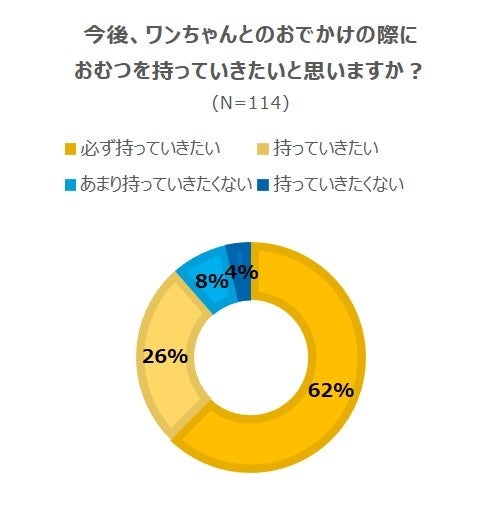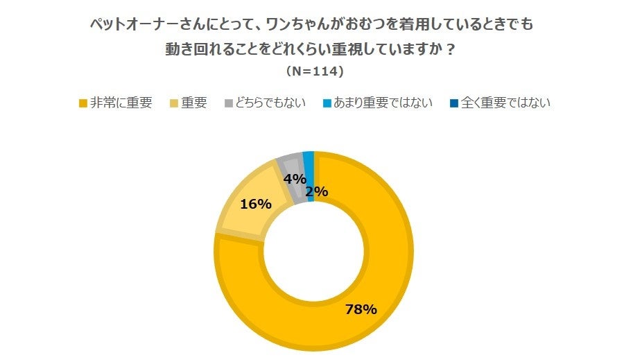 アンケートでは、83%のペットオーナーさんがワンちゃんとのおでかけの際に「おむつ着用を求められる場面が増えてきた」と感じていると回答。また、「おでかけをする際にはおむつを持っていきたい」と回答した方は88%にのぼりました。このように、外出時におむつを持っていくということがオーナーさんの意識に定着している中で、94%の方がワンちゃんがおむつを着用しているときでも普段通りに動けることが「重要」と回答しました。施設やペットオーナーさん側のメリットだけではなく、ワンちゃんにとってもおむつの装着がマイナスにならず、普段通りに動けることが重要視されているということがわかりました。