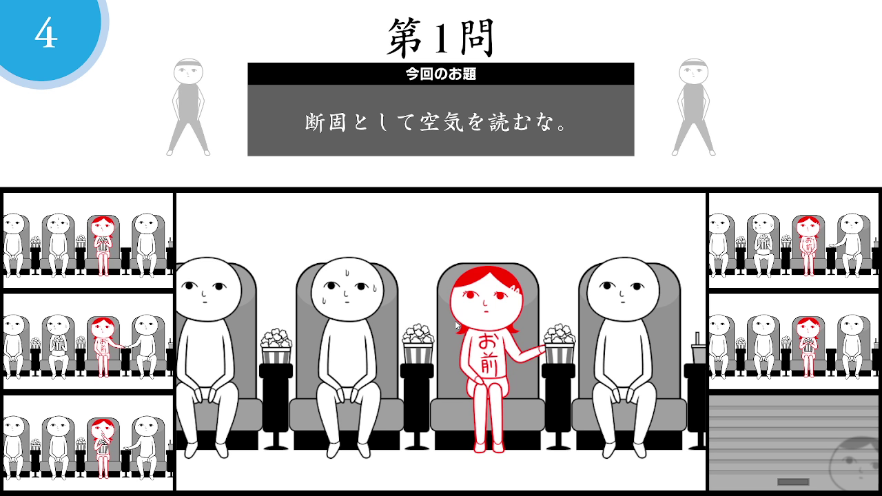 最大7人の空気読み。プレイヤーがマッチング。出題されるお題にあわせて参加プレイヤーは空気を読みましょう。空気読み問題終了後、全員のリプレイが再生されるので「お、空気読めてるじゃん!」「面白いプレイするなぁ!」と思ったプレイヤーに投票してください。