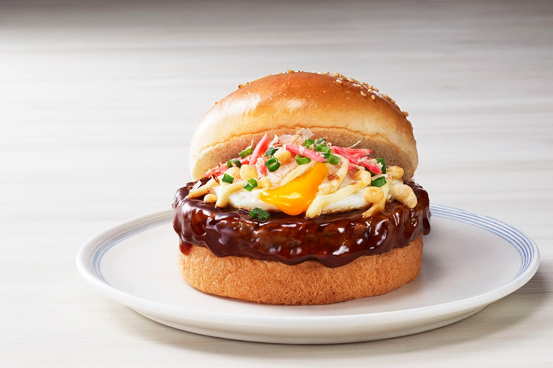 大阪といえばお好み焼き!ソイミートバーガーをお好み焼き風に仕上げました。オタフクソースとソイミートがおいしいコラボ!とろ~り半熟風のオムレツと紅生姜、あげ玉、 ネギのトッピングが食欲をそそります。