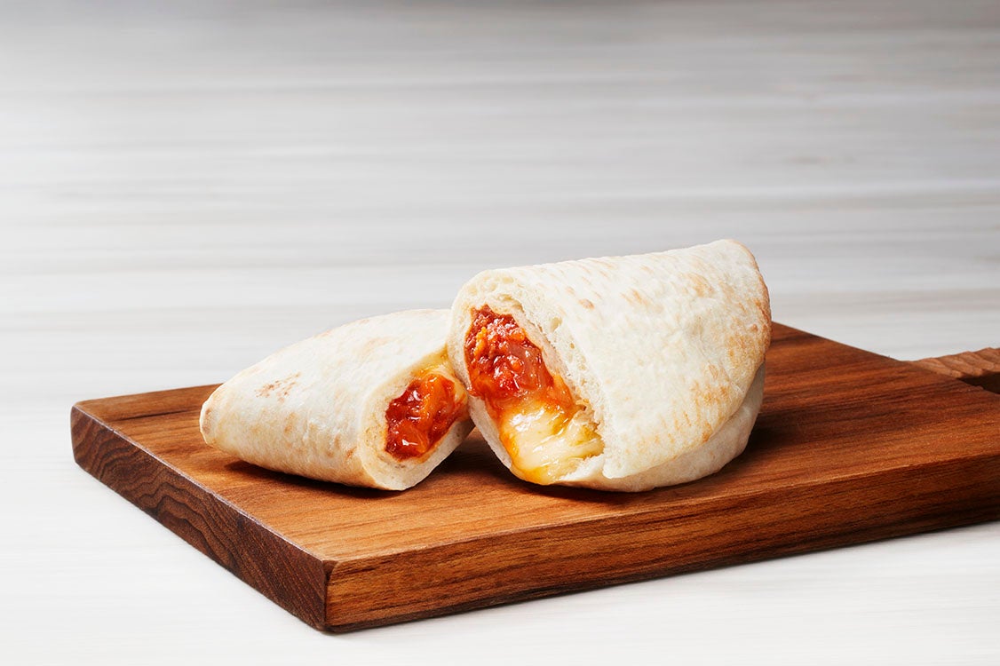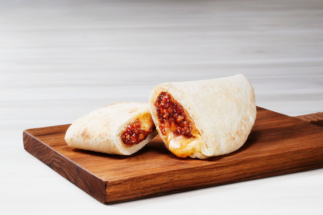 ワンハンドスナックタイプの食べやすい包みピザ。ソイミートソース や タコスミート ソースで食べやすい味に仕上がっています。