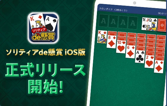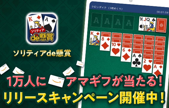 また、今回のリリースを記念して、総勢1万名様にギフトカードが当たる「ソリティアde懸賞 iOS版リリースキャンペーン」を開催しており、iOS機種を利用されている方々にも、長く愛されているカードゲーム「ソリティア」をスマホで手軽に遊んでいただきながら、懸賞をお楽しみいただきます。
