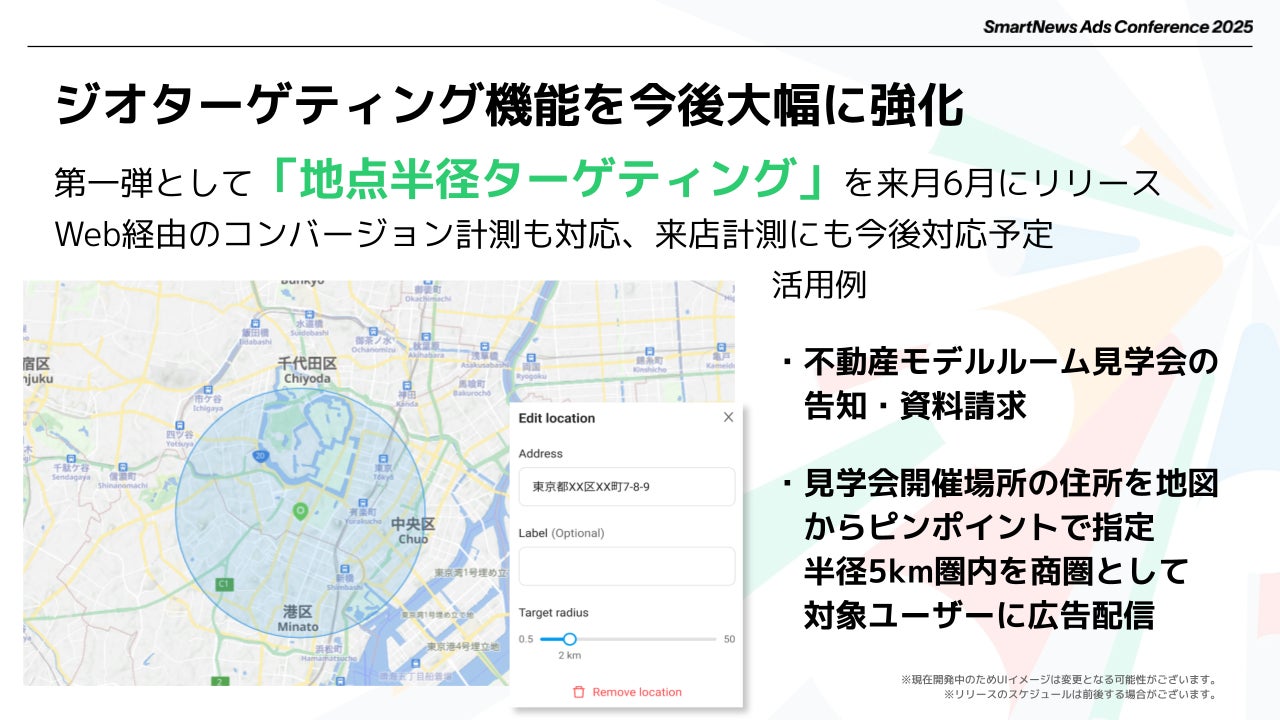 そして、そうした価値をさらに高めていくべく、SmartNews Adsソリューションのアップデートロードマップを開示し、Marketing Objectivesのファネルごとにプロダクトを提供していく考えを明らかにしました。リーチ認知、想起・理解・利用意向などハイファネル領域に対しては、「Top News Ads」「New Premium Ads」といった、すでに多くの成果を上げている既存プロダクトのアップデートに加え、「チャンネルジャック Ads」などの新プロダクト追加(2025年6月ローンチ予定)や、データクリーンルームの大規模アップデートを予告。新たな挑戦となるセールスプロモーション領域についても、2025年6月に「地点半径ターゲティング」を用いた広告配信が可能になると発表しました。