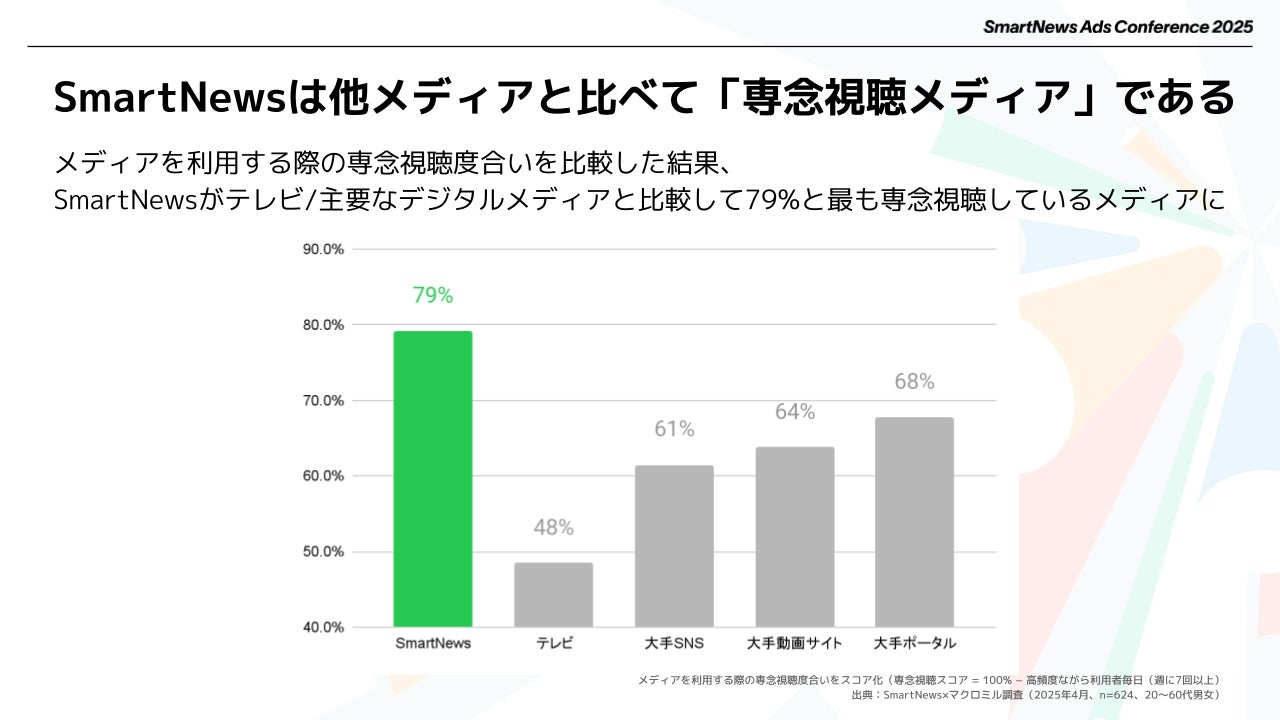 山田はまず、生活者を取り巻く環境の変化や、広告への接触反応の低下といった昨今のマーケティング活動における課題に言及。特に「ながら見」の習慣が日常化している課題について、最新の自社調査により、SmartNewsは他の主要なデジタルメディアと比較しても群を抜いて「専念視聴」されているメディアであることが証明されていると述べます。