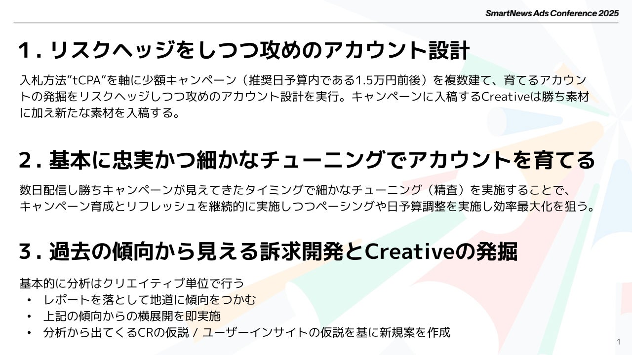 対象案件は単品通販サプリメントで、過去伸長していたアカウントが伸び悩んでいる状況でした。このアカウントを復活させるための運用手法として、以下の3つのポイントを挙げました。