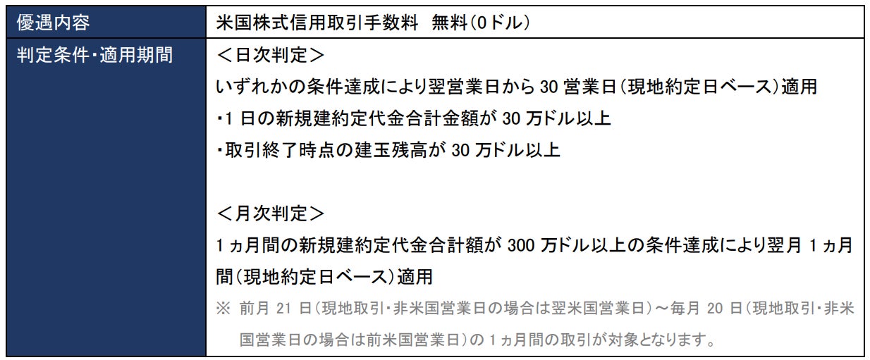 2023年9月25日(月)現地取引分から取引金額、建玉残高の判定を開始し、条件を達成した場合は、最短で2023年9月26日(火)現地取引分から米国株式信用取引手数料無料が適用されます。