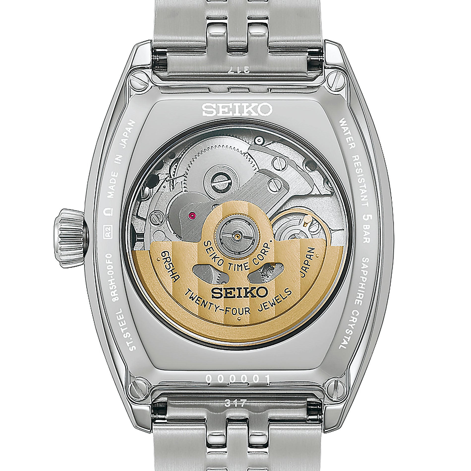 本作は、日本の伝統工芸であり、職人の高度な技術によって生み出された琺瑯ダイヤルのモデルです。そして、日本の美意識を発信するセイコー プレザージュの現行モデルにはないトノー型ケースを採用しました。精工舎が1895年に製造した初の懐中時計「タイムキーパー」を讃えて、ダイヤルにはその特徴的なデザインを取り入れています。トノー形状に合わせて配置したローマ数字のインデックス、琺瑯ならではの艶やかな立体感を引き立てる24時針のサブダイヤル、レール(線路)のようにデザインしたダイヤル外周の目盛が、クラシカルな印象を際立たせます。また、分針と秒針の先端をダイヤル側に曲げることで目盛との距離を近づけ、時刻の読みやすさを追求しました。