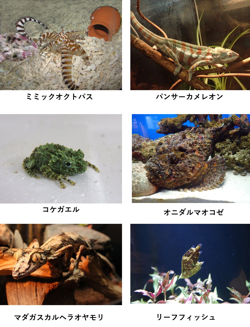 特設展示では、パンサーカメレオン、ミミックオクトパス、ヘラオヤモリ、ハナカマキリ、カレハカマキリ、チャカチャカ、ヤエヤマトガリナナフシ、リーフフィッシュ、コケガエル、コノハガエル、モクズショイ、コンビクトブレニーという“擬態”する生きものたちを12種類展示いたします。