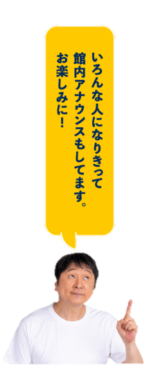 期 日 : 10月12日(土) 時 間 : 9:00~ 1日館長就任&開館 お客さまお出迎え 11:45~ モノマネライブ① 14:45~ モノマネライブ② ※「擬態展」と特設展示会場および館内、グッズ販売会場などを巡回 ※生館内アナウンス 場 所 : 館内各所 |