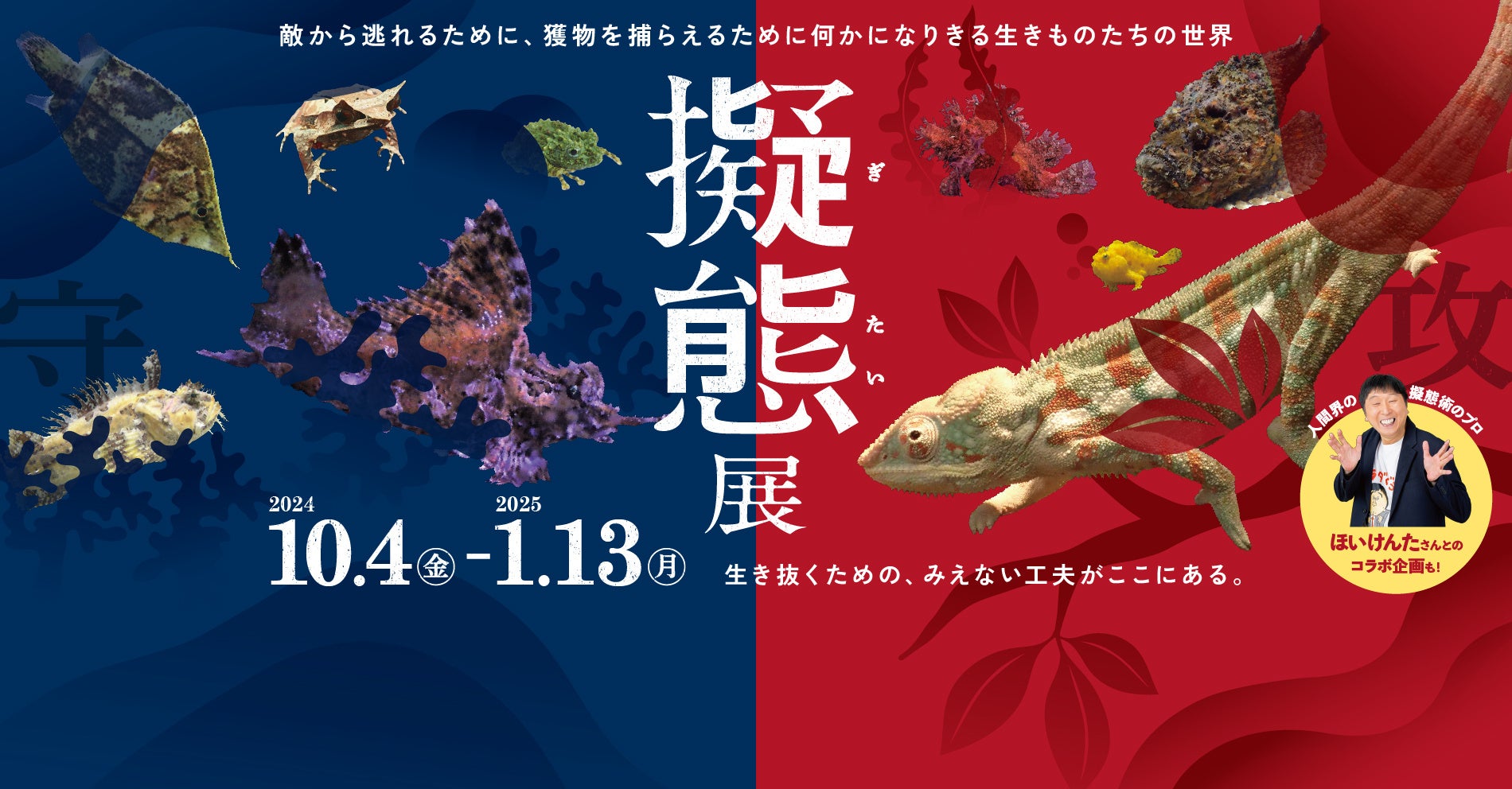 海と人、水と人との、新しい「つながり」をうみだす水族館『仙台うみの杜水族館』では、2024年10月4日(金)~2025年1月13日(月・祝)の期間、“擬態”する生きものたちをフィーチャーし、生きものの不思議な生態に迫る企画展「擬態展」を開催いたします。約30種類の生体展示に合わせ、それぞれの種類によって異なる“擬態術”についてパネルで紹介し、厳しい自然界を生きてきた生きものたちの不思議な生態について学べる展示です。敵から逃れるために、獲物を捕らえるために、何かになりきる生きものたちの世界を楽しめます。