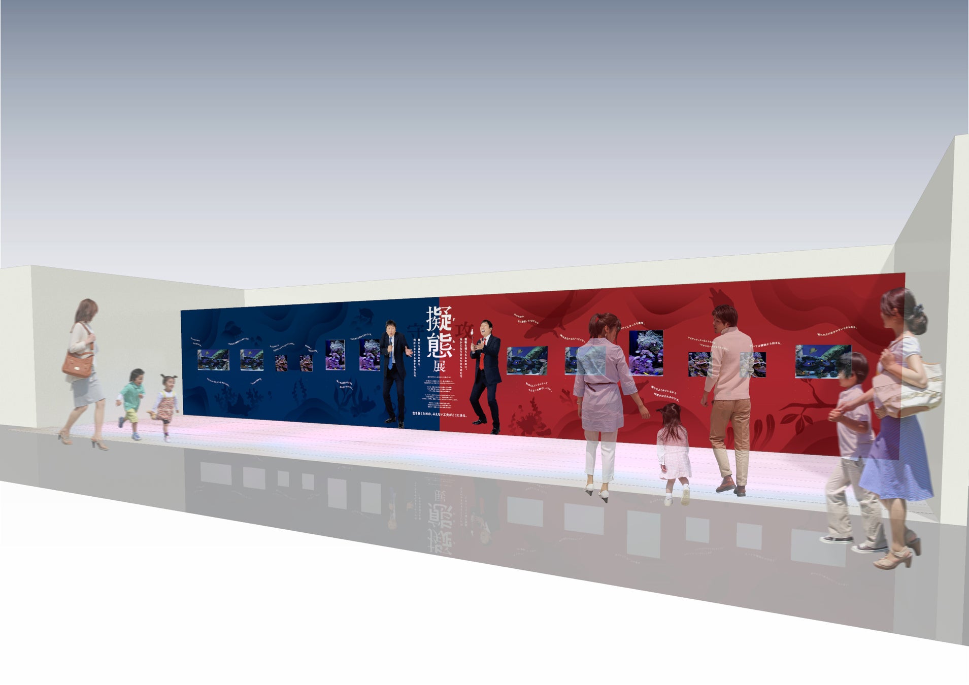 そんないわば、人間界の擬態術のプロである「ほいけんた」さんにご参加いただき、擬態術を語る「ほいけんた」さんのオリジナルムービーや、「ほいけんた」さんが誰かになりきって行うオリジナルボイス館内放送、「クラゲのいやし」エリアにはクラゲになりきる「ほいけんた」さんがプロジェクションマッピングで登場するなど、擬態展とのコラボ企画を実施し、さまざまな擬態の世界を楽しめます。