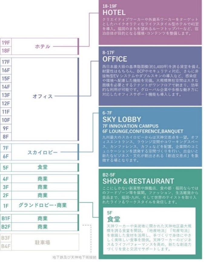 両社グループでは、今回の〈みずほ〉のワンビル出店を通じて、天神ビッグバンにおける都市機能の充実などに加え、天神明治通り街づくり協議会(MDC)が掲げる目標像 『アジアで最も創造的なビジネス街』 の実現に寄与してまいります。