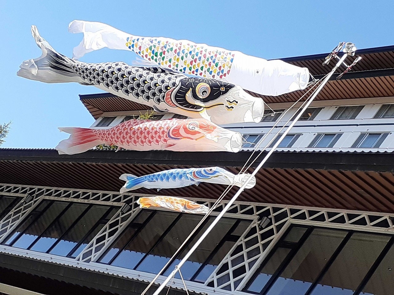 そして、完成した鯉のぼり(コイタロウ)は、ホテルの入り口に飾られ、