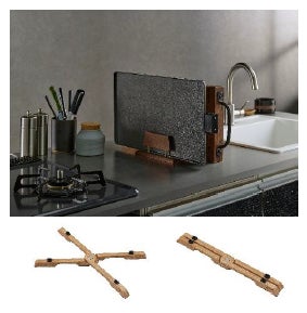 まな板スタンドに立てかけられる(※4)薄型プレートと折りたためるX型の脚は狭い場所にも収納できます。プレートにヒーターを内蔵することで食材を均一に高火力で加熱します。プレートは丸洗いも可能なため手入れが簡単です。「自宅でもキャンプをしているような特別感や高揚感を感じてほしい」という開発コンセプトから、X型の脚はアウトドア用の鍋敷きや木の台をイメージしており、木目調のデザインは料理を華やかに引き立てます。