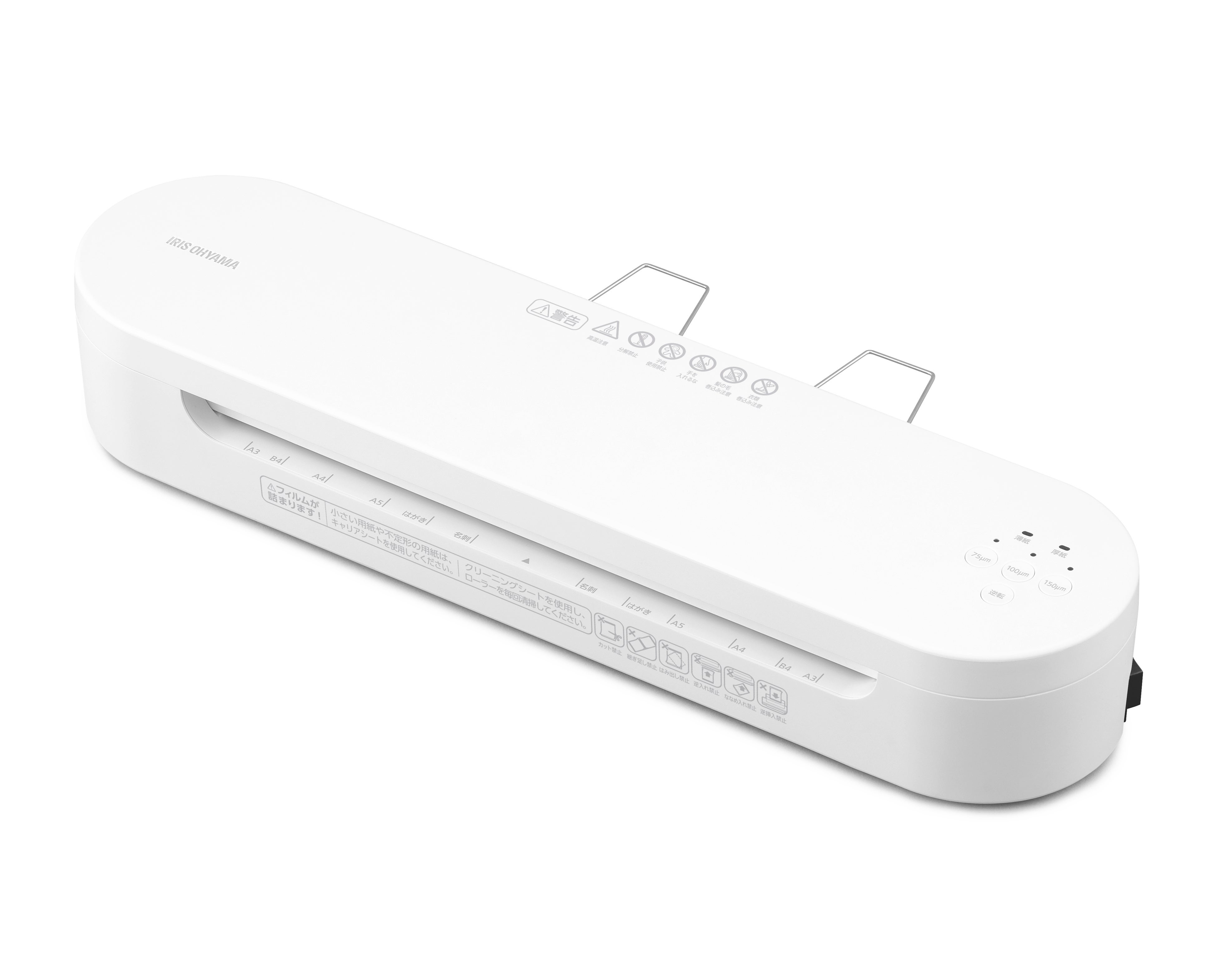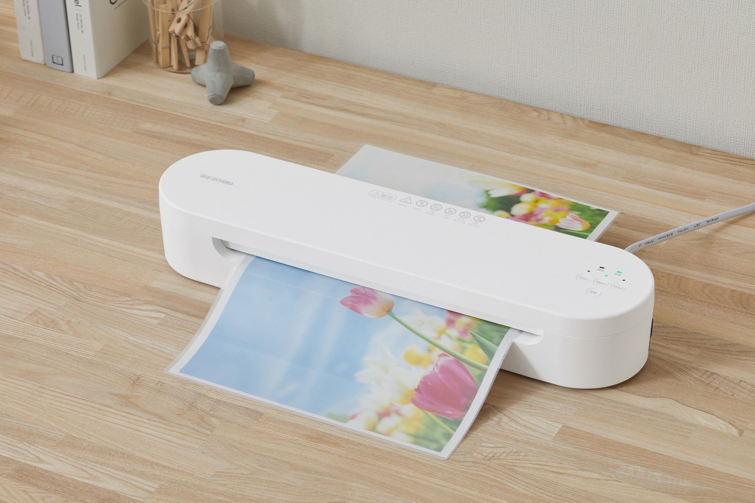 楕円形の本体に合わせボタンの色も統一しており、インテリアに馴染むシンプルなデザインです。電源を入れてから約35秒で起動し、A4用紙1枚あたりのラミネート時間は約30秒(※5)と高速で加工できます。4本のローラーでしっかり圧縮するので、仕上がり時の反りを抑えられ、ラミネート後のフィルムを受け止めて変形を防ぐワイヤートレーは本体裏に収納できます。