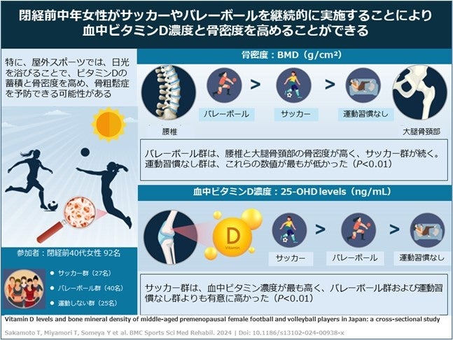 体内のビタミンD貯蔵量が高いと骨密度も高くなりやすいとされていることから、閉経前にサッカーをはじめとする屋外スポーツの定期的な実施は、血中25-OHD濃度を高め、閉経後の骨量減少を抑制し、将来的には骨粗鬆症を予防できる可能性があります。