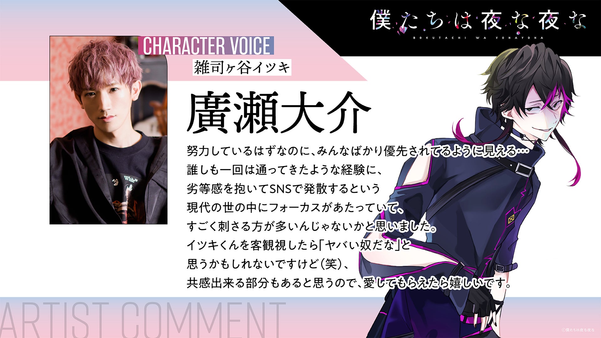 本当の自分を解放する共感性ドラマコンテンツ『僕たちは夜な夜な』(通称『僕よな』)。キャラクターが抱えている「苦悩」を声優ボイス付きショート動画で吐露し、ボカロP×歌い手によって「感情」が歌になる今作!