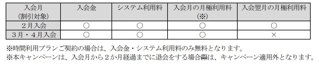 また、2月18日(金)~4月30日(土)の期間中に入会された方は、入会金・システム利用料・ 入会月の月極利用料が無料となる「オープニング・キャンペーン」も実施します。