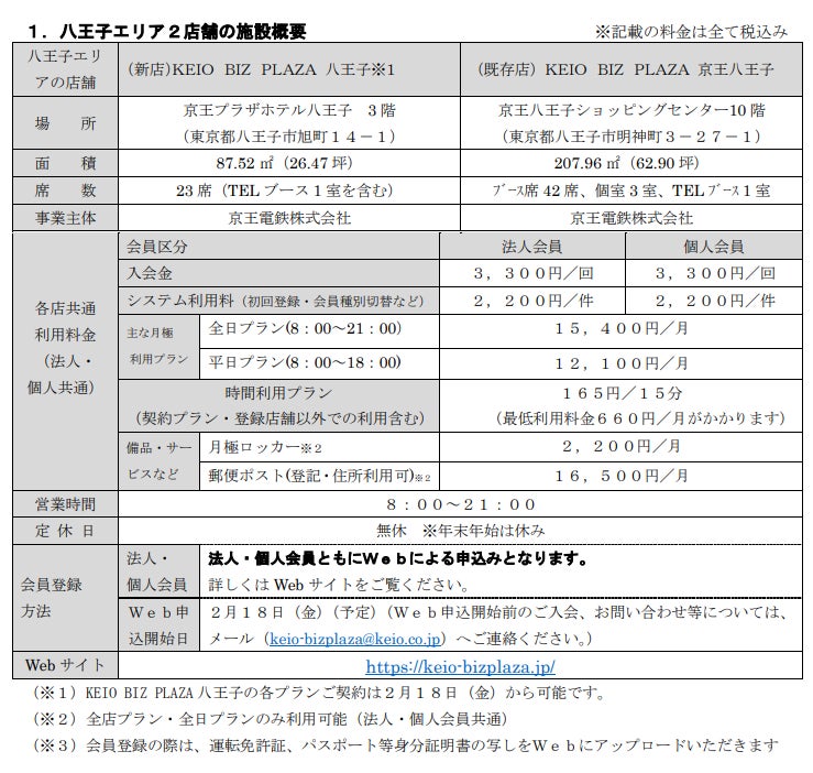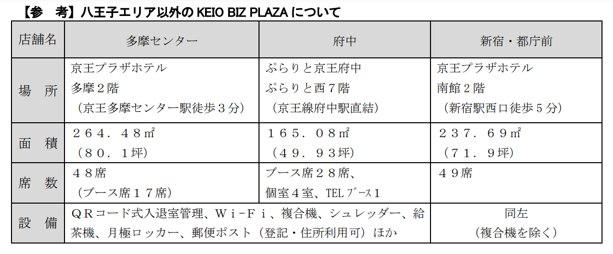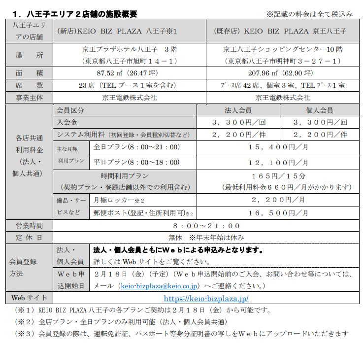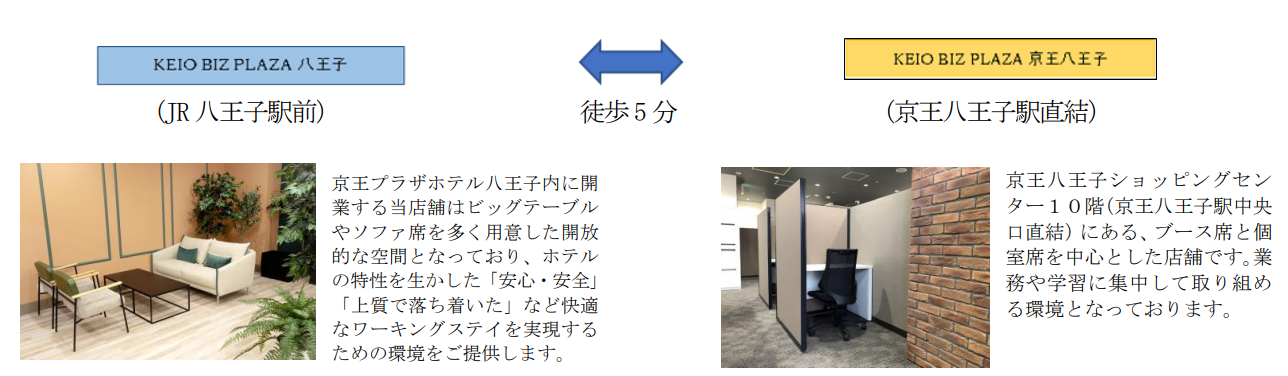 本施設の開業により、1店舗分の料金で既存店の「京王八王子店」と併用利用ができる 「八王子エリアプラン」を新設します。(京王八王子店の既存会員の方も八王子店を併用して利用 可能です。)ブース席を中心とし業務や学習に集中して取り組める「京王八王子店」と、ビッグ テーブルやソファ席を多く用意した開放的な空間で執務ができる「八王子店」の両店舗を 、目的や 働き方に合わせてご利用いただけます。