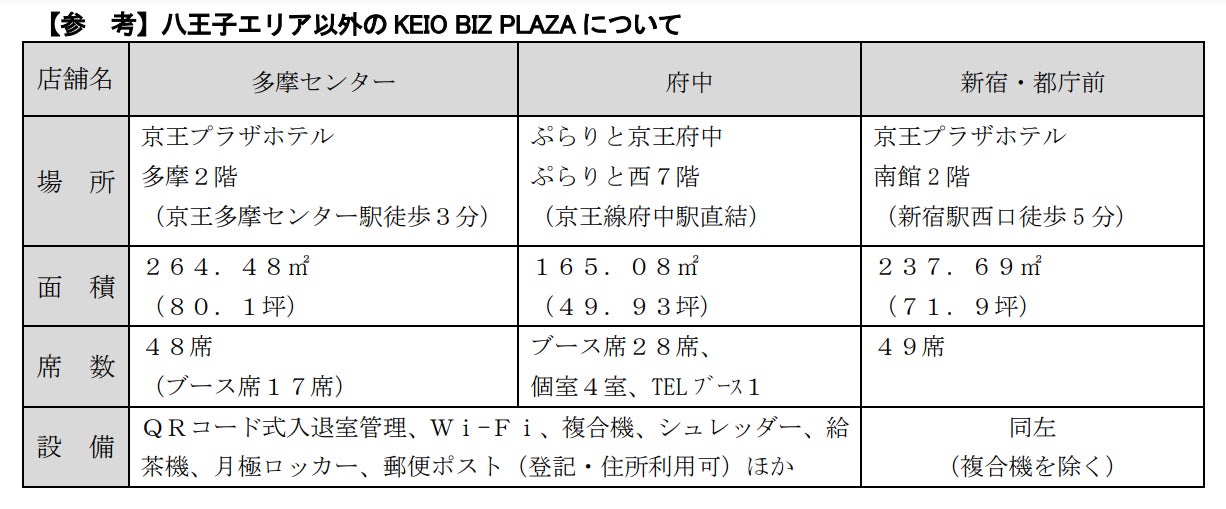 なお、本施設が入居する京王プラザホテル八王子では、新型コロナウイルス感染症拡大防止を目的とした 多様かつ柔軟な働き方が浸透する中で「テレワーク」や「長期滞在」など、コロナ禍での新たなニーズに 対応した多様な商品の提供を進めています。この度、京王電鉄が京王線沿線に展開するサテライトオフィス 「KEIO BIZ PLAZA」を開業し、ビジネスパーソンが集う施設やサービスを提供することで、相互に連携 しながら柔軟な働き方の実現をサポートします。